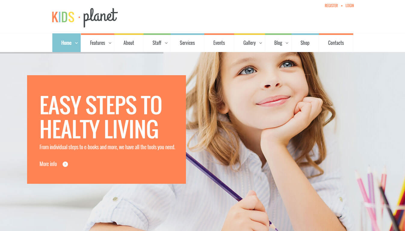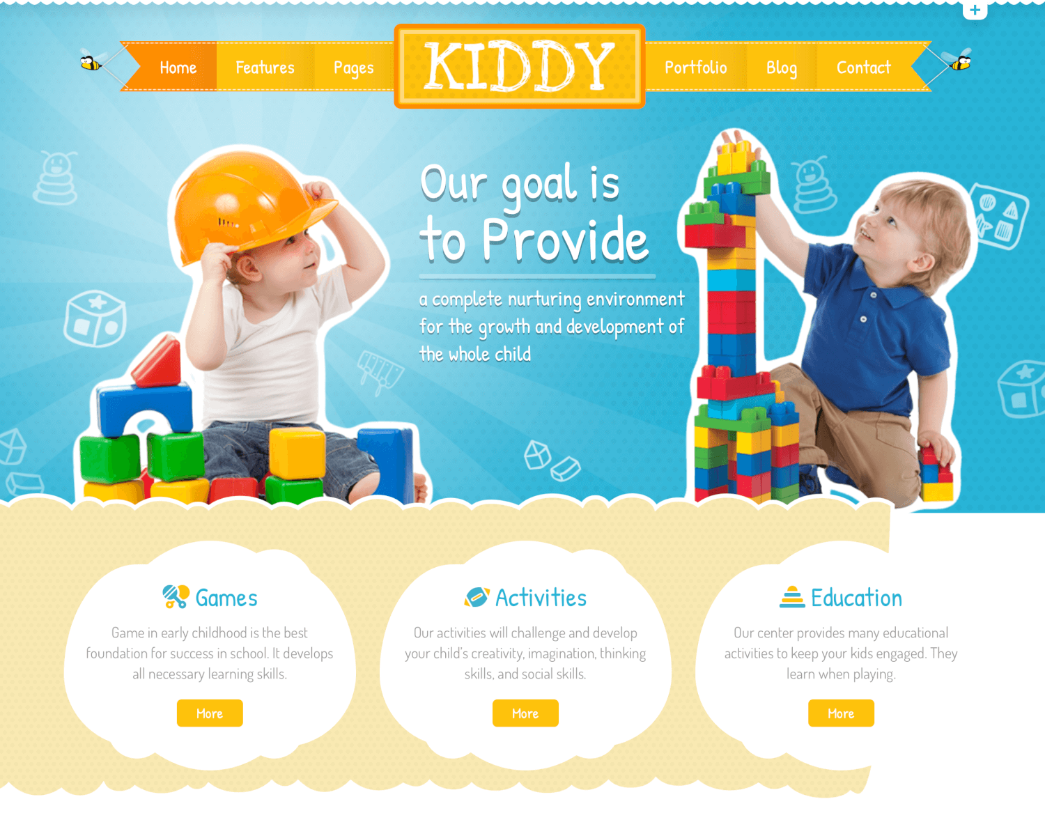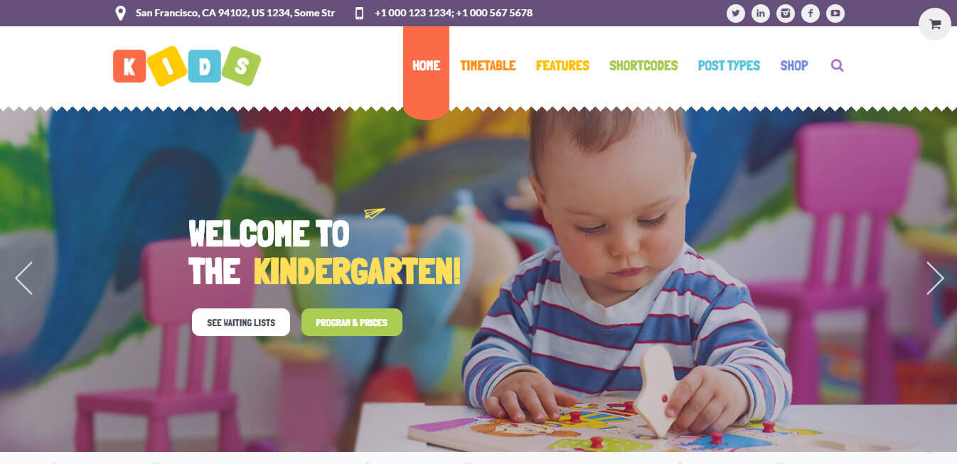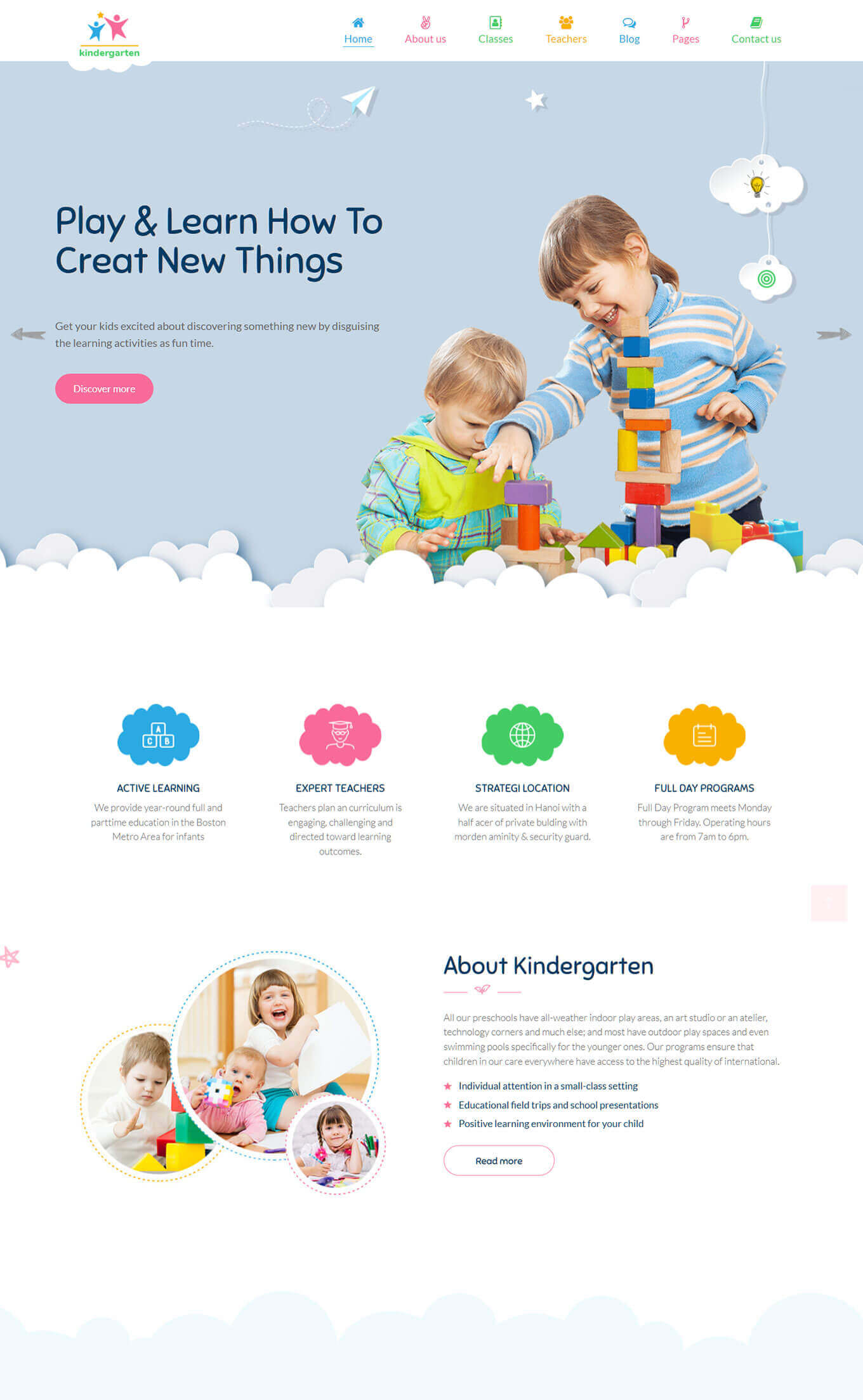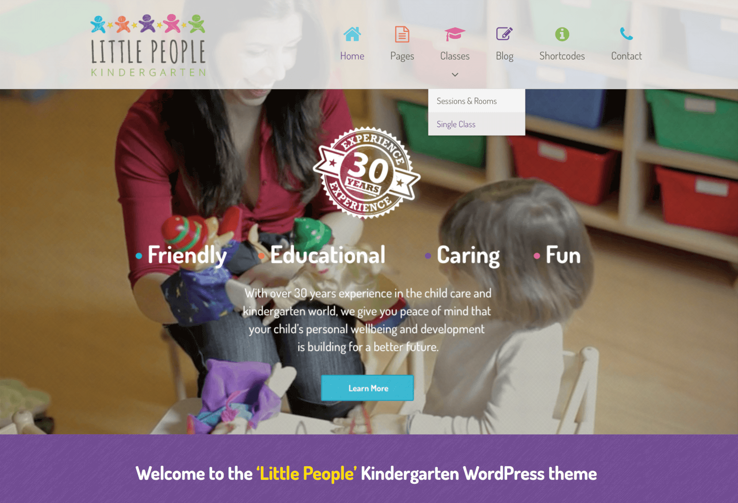 A powerful WordPress theme suitable for a wide variety of children-oriented websites. A playful and colorful design, complete with “flat” graphics and copious white space, set this theme apart from others and makes it applicable for kindergartens, pre-schools, schools, child care and many other businesses.