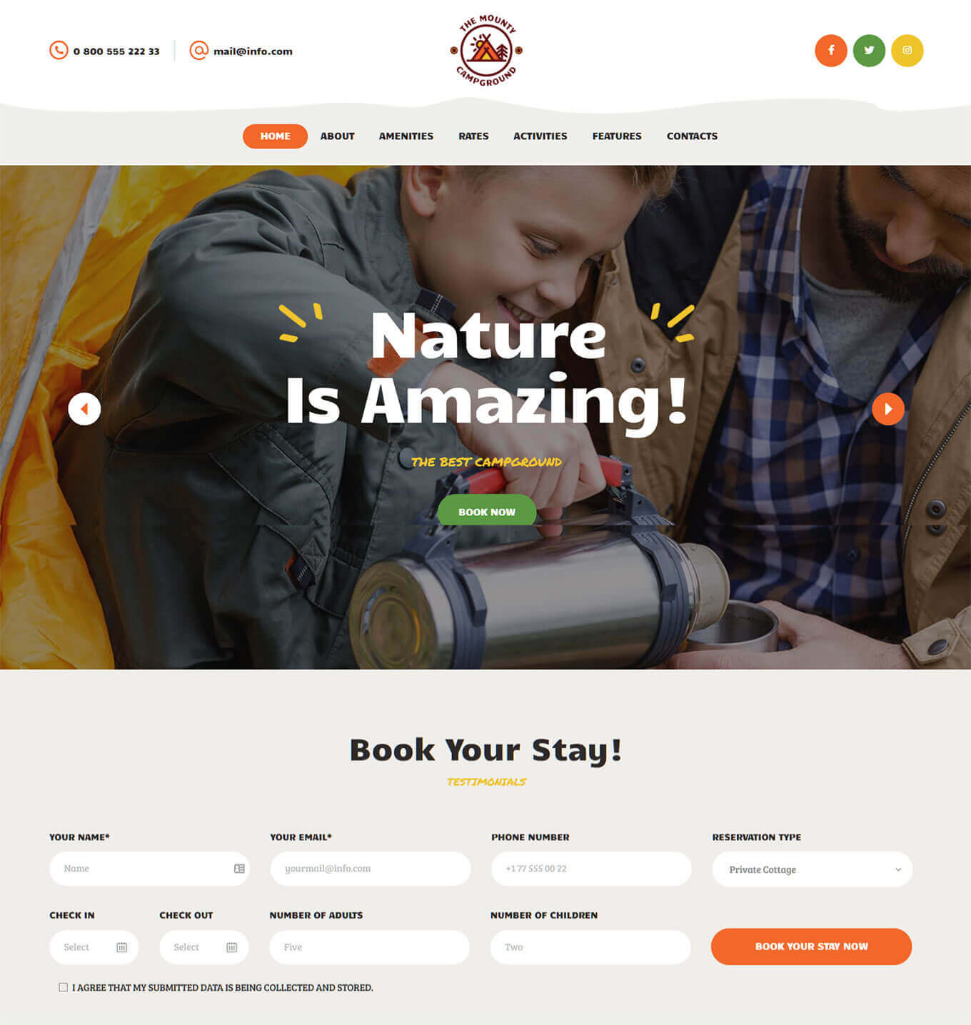 The Mounty is a campground WordPress theme that should be of interest to anyone creating a website for a campsite that aims to attract families and their children. The package includes two different homepage layouts that should do a great job of promoting your campsite, whether it’s a family destination or a place for kids\’ camps.