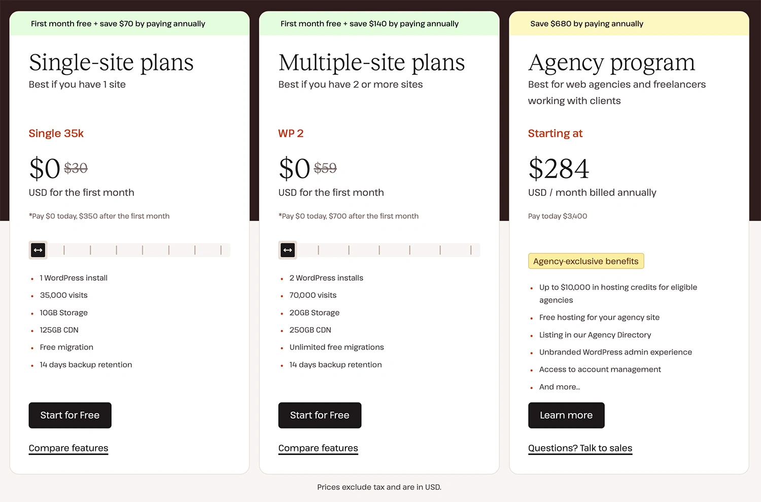 • Multiple-site plans: From $59 per month for hosting 2 websites with 20GB SSD storage. Best for serving 70,000 visitors per month.